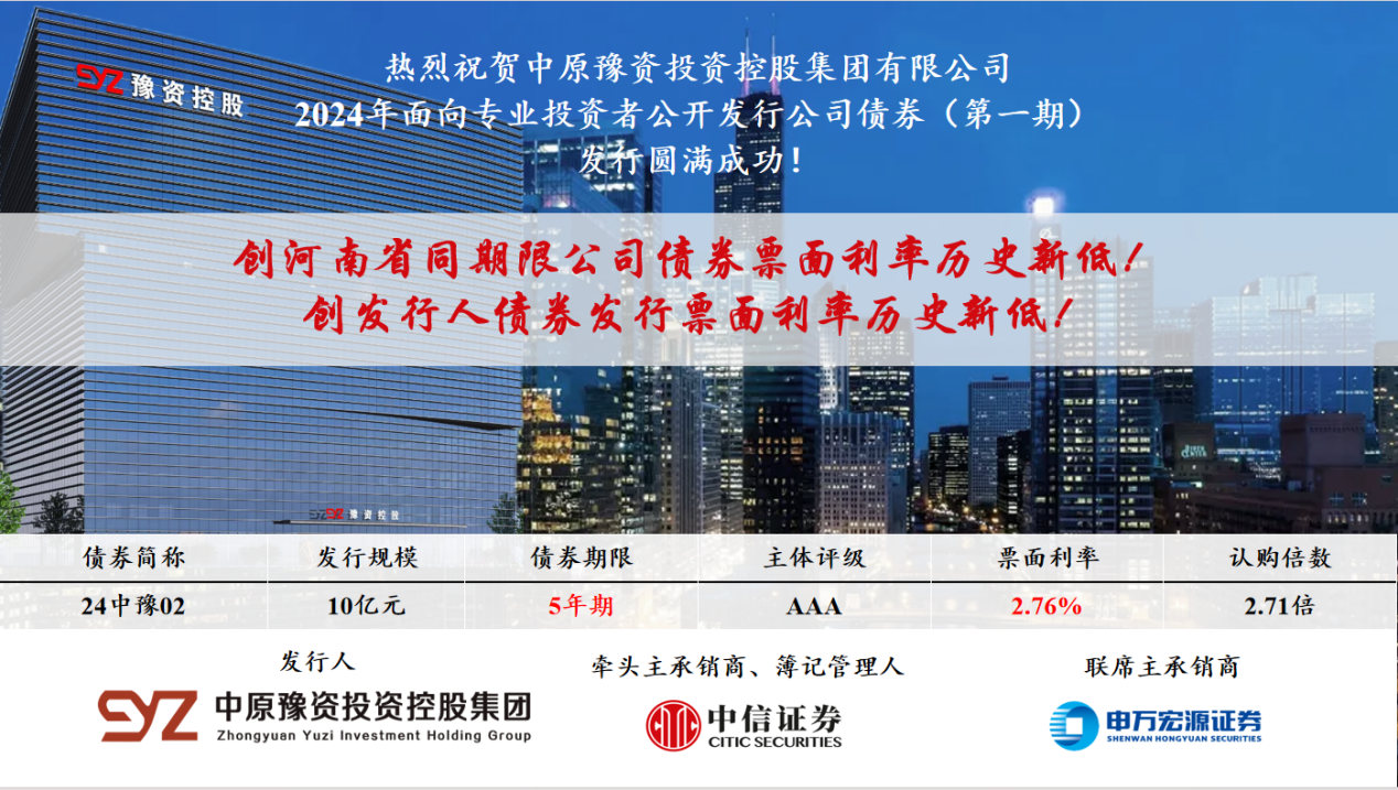 熱烈祝賀中原豫資投資控股集團有限公司2024年面向專業投資者公開發行公司債券(第一期)發行圓滿成功!2024.03.08